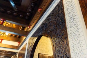 މިސްކިތުގެ ފާރުތަކުން ފެންނަނީ ކުރީގެ ހިރިގަލުގެ މިސްކިތްތަކުން ފެންނަ ފަދަ ނަލަ ކުރެހުންތަކާއި ޑިޒައިންތަކެވެ. މި ހުރިހާ މަސައްކަތަކީވެސް އަތުން ކަނޑާނަގައިގެން ތައްޔާރުކޮށްފައިވާ އާދަޔާ ހިލާފު މަސައްކަތްތަކެކެވެ.